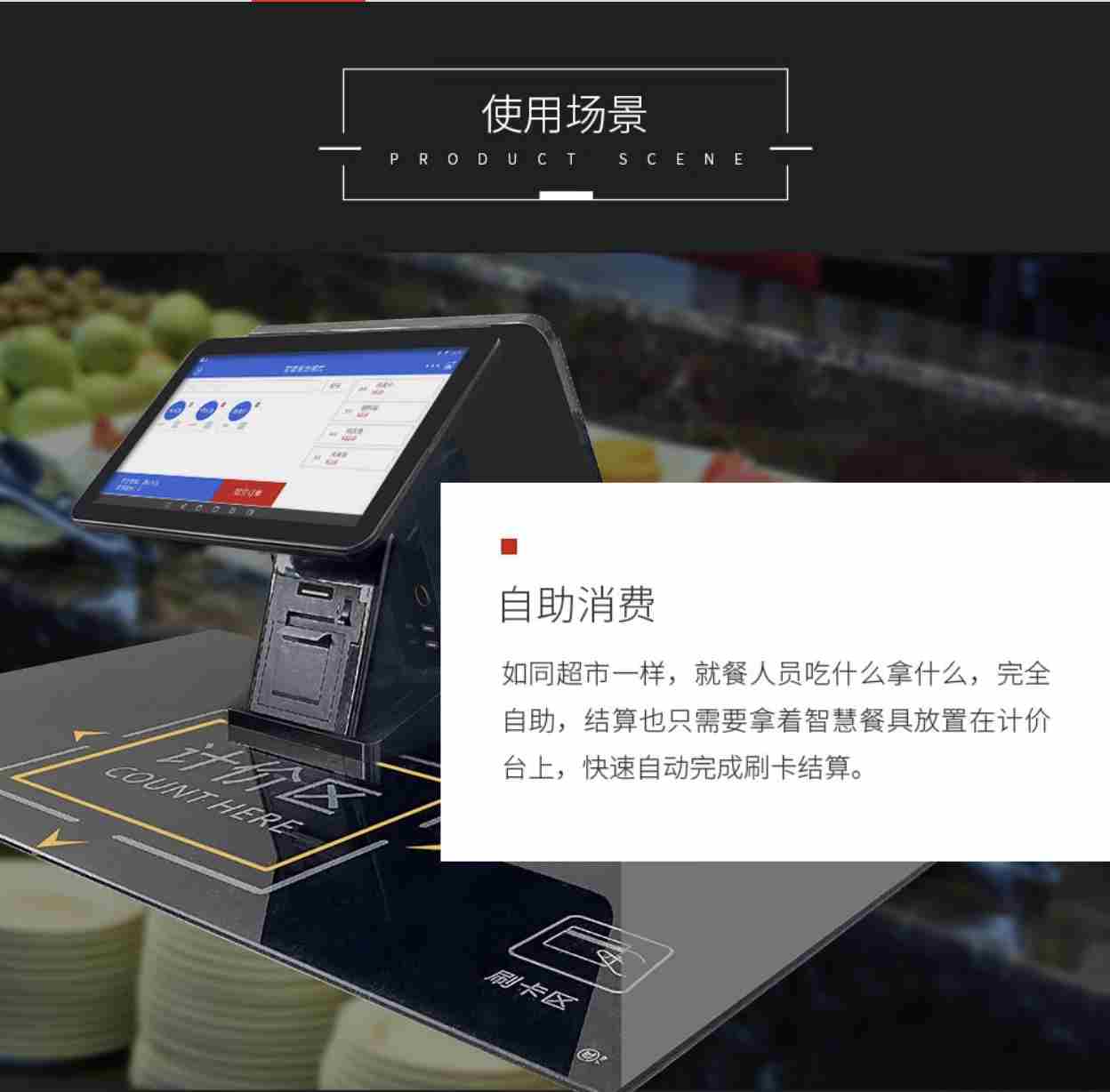 智新云自助结算餐台是通过在餐具内部植入电子标签,再通过餐台扫描餐具内的电子标签来识别对应餐具所代表的菜品明细和单价,刷卡、扫码、人脸识别等方式完成快速结算。